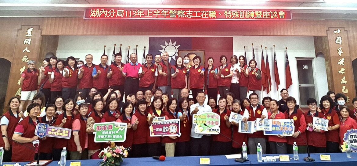 座談會由湖內分局分局長陳楨筌主持,副分局長侯智評、偵查隊歐隊長、防治組蔡組長及相關分駐(派出)所所長列席參加,會中並頒發112年高雄市志願服務獎章金質獎1人,銀質獎及銅質獎各10人,113年績優志工榮譽獎狀6人,共有27名志工獲獎,銅質獎需服務500小時,銀質獎需服務1000小時,金質獎需服務1250小時,金質獎僅阿蓮分隊劉桂玉獲得,劉員自99年加入志工團隊服務至今近14年,其熱心公益不辭辛勞,難能可貴。志工中隊長賴秀紅勉勵志工夥伴能建構警民良好橋樑,改變里民對警察刻板觀念。會中藉由各志工夥伴工作經驗傳承,拉近志工團隊彼此間的距離及認識,同時更加深志工們對此工作的使命感。常訓課程由湖內分局防治組講授志工領導與服務學習、提示工作重點;偵查隊宣導近期常見詐騙手法,並告知”165反詐騙專線‘’諮詢功能;交通組宣導交通事故防制及交通安全觀念。另特別安排湖內區衛生所宣導登革熱防治及傳染病衛教,教材內容豐富實用,希望能由在場志工當成種子教官,推展至鄰里。