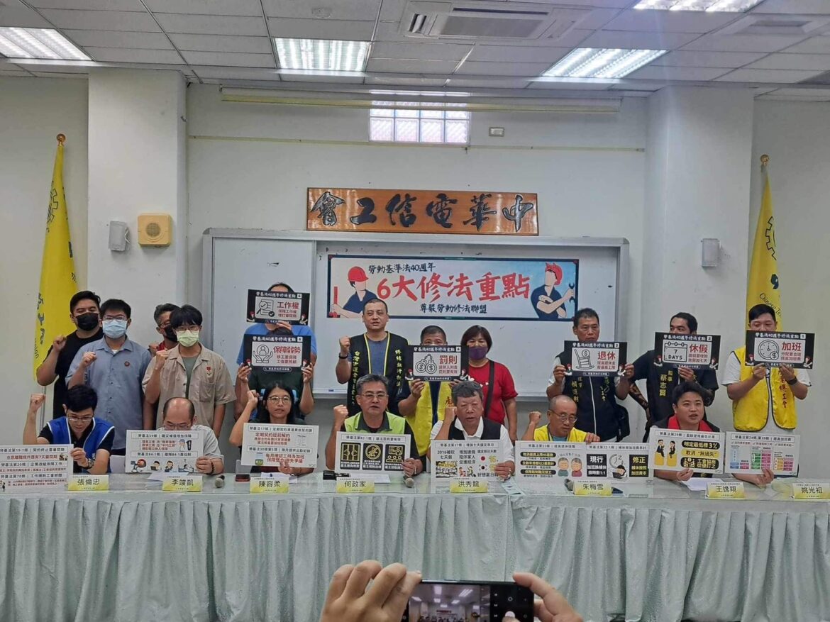 記者會一開始,主持人中華電信工會罷工小組研究員姚光祖表示,在勞基法實施40週年之際,由全國各地產總、各產職業類別的總工會與產職業工會、中華電信工會、工傷協會和台灣國際勞工協會等工會和工運團體共同組成的尊嚴勞動修法聯盟,將在今天記者會上,公布聯盟建議的修法條文草案,針對勞基法實施40週年以來的種種不足,提出提高加班費、還我七天假、增加退休金、保障工作權、弱勢要保障以及罰則要有效等六大修法方向。
