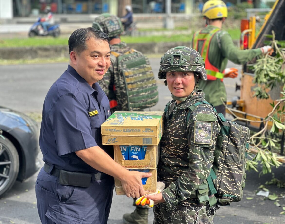 分局長謝承甫體恤員警、國軍弟兄、環保清潔兄弟姐妹辛勞,特別購買飲料逐一發送到每位執行復原工作人員手上,為他們在炎熱天氣下工作帶來解渴的飲品,藉以滋潤每位人員日夜辛勞的心靈,感謝他們不停歇地連續趕工,為用路人和鄉親們清理出安全的道路,維護道路安全。
