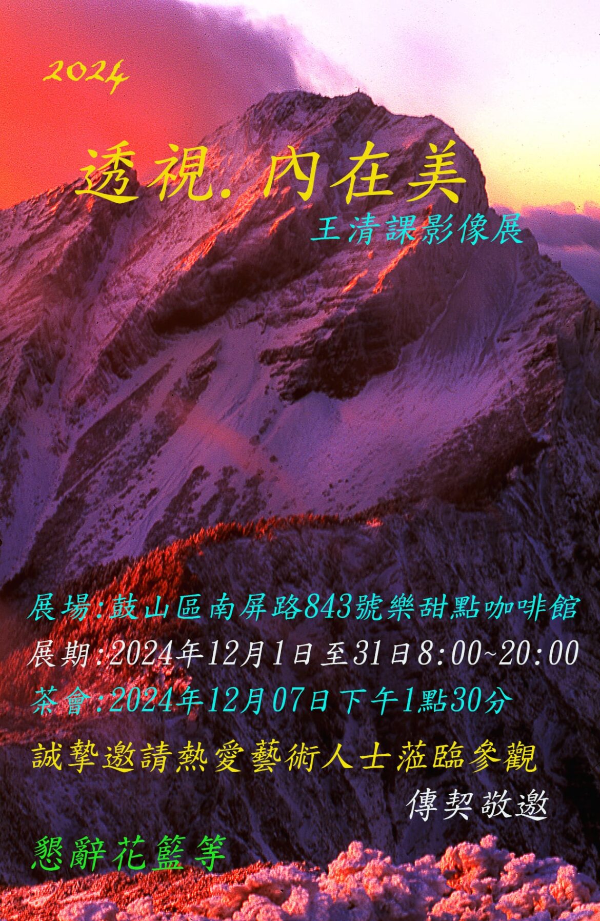 壓倒元白『透視』–內在美 王清課影像展即將在南屏路843號樂甜點咖啡館揭幕,臺灣是王清課的家鄉,他是這塊豐饒土地上的住民,所以感到無比的榮幸。他經常喜愛出走到國內外的各處美地景點,甚至是地球的南北極地、撒哈拉沙漠等美景等。