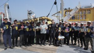 出港儀式現場氣氛熱烈,韓籍漁撈長與船員手持加油手板合影,展現國際團隊的向心力,而全體工作人員也到場為船員打氣。華偉漁業董事長黃一茂與高雄市漁會總幹事親自送上祝福,強調持續強化後勤補給與人員調度,做船員最堅強的後盾。隨著固定的繩索鬆綁,在領港船隻帶領下,黃鰭滿儎正式啟航,前往太平洋漁區作業,碼頭邊鞭炮聲歡呼聲迴盪在海風中,象徵嶄新的豐收航程正式展開,期許他們以專業與團隊合作精神,完成接下來的捕撈任務。