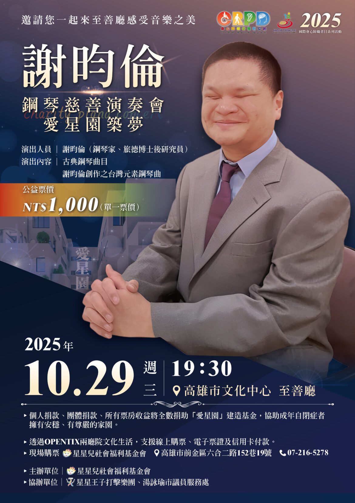 這場音樂會不只是藝術饗宴,更是一場社會行動。所有票房收益(扣除必要成本後)將全數捐助「愛星園」建造基金,協助成年自閉症者擁有安穩、有尊嚴的家園。邀請您購票參與,不只是欣賞動人的音樂會,更是親手為自閉症者築夢。
