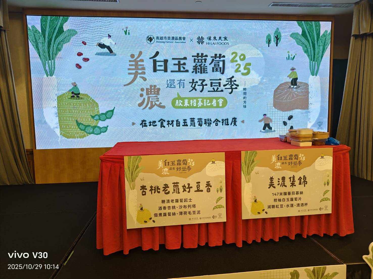 高雄市美濃區農會今(10月29日)於高雄漢來大飯店舉辦「2025美濃白玉蘿蔔還有好豆季」股東招募記者會,正式啟動本年度白玉蘿蔔與好豆股東會活動。今年以「從產地到餐桌」為核心精神,串聯在地農民與南部最大餐飲品牌——漢來美食,共同打造跨界合作新模式,展現美濃農業的多元風貌與食材魅力。