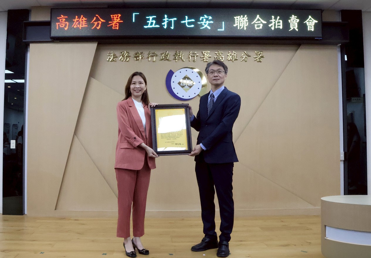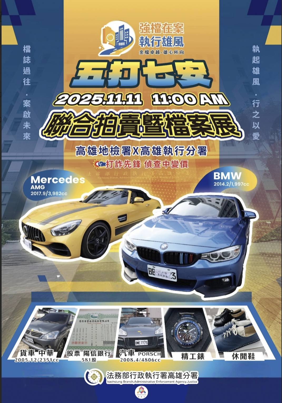 法務部行政執行署高雄分署(下簡稱高雄執行分署)落實行政院五打七安政策所舉辦之『五打七安聯合拍賣會暨囑託變價檔案展活動』於今日(11月11日)上午熱鬧登場。本次拍賣會拍定高雄地方檢察署(下稱高雄地檢署)囑託變價之賓士敞篷名車、5筆位於鳥松區之不動產及1棟旗山區房屋,總拍定金額高達3,336萬6,750元,充份展現高雄分署貫徹五打七安政策及『檢執聯手』打擊犯罪之成果。