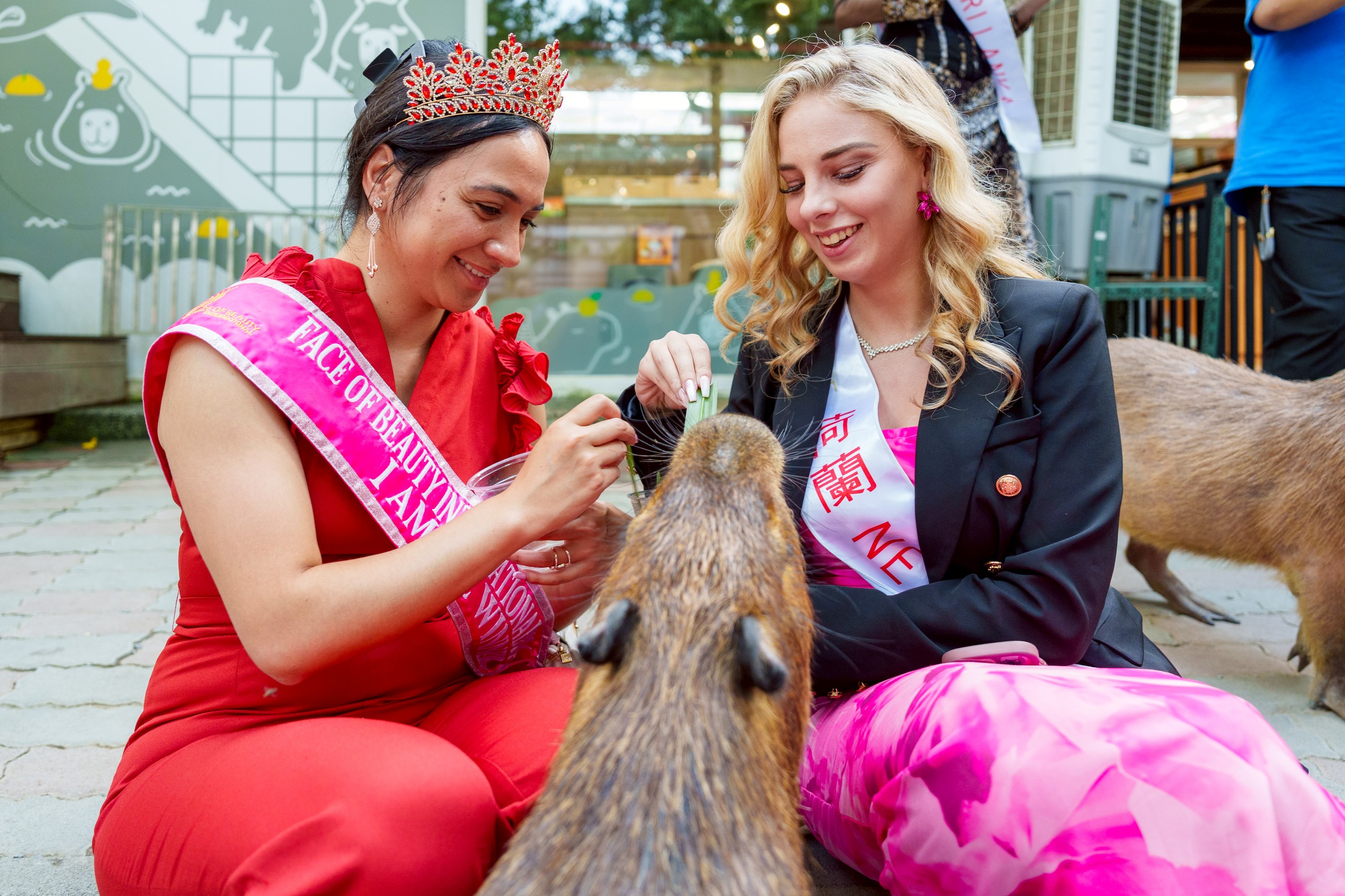 現場可以看到佳麗抱著狐獴合照、蹲下餵食水豚,甚至有人被羊駝的可愛眼神融化,不停直呼「So cute!」。