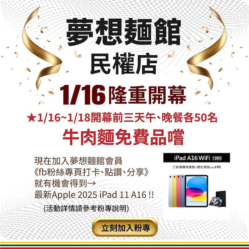 同時,品牌結合LINE官方帳號與Facebook社群,規劃消費打卡與抽獎活動,最大獎為最新款iPad,並公開抽獎流程,提升透明度與信任感。此舉不僅放大品牌聲量,也有效累積會員資料,為後續經營奠定基礎。從行銷角度觀察,夢想麵館的操作已不再侷限於單次促銷,而是朝向長期顧客關係經營,展現新型態餐飲品牌的策略思維。