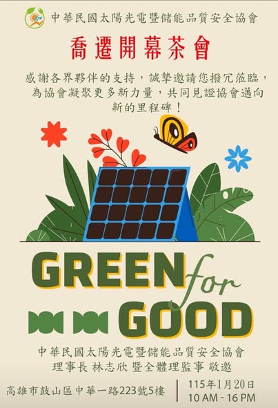 中華民國太陽光電暨儲能品質安全協會自成立以來,致力於建立太陽光電與儲能系統的品質、安全與專業標準,是全台少數同時關注光電與儲能整體發展的專業社團。此次遷址,除因應服務量能擴大,更象徵協會邁入組織深化與公共責任並重的新階段。